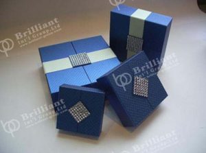 3) The design of “Square J. Box, R-016” is very simple design with a Navy blue Satin Cloth inside a Navy blue box. 2 sides doors opening with a magnet Closure of a rhinestones.